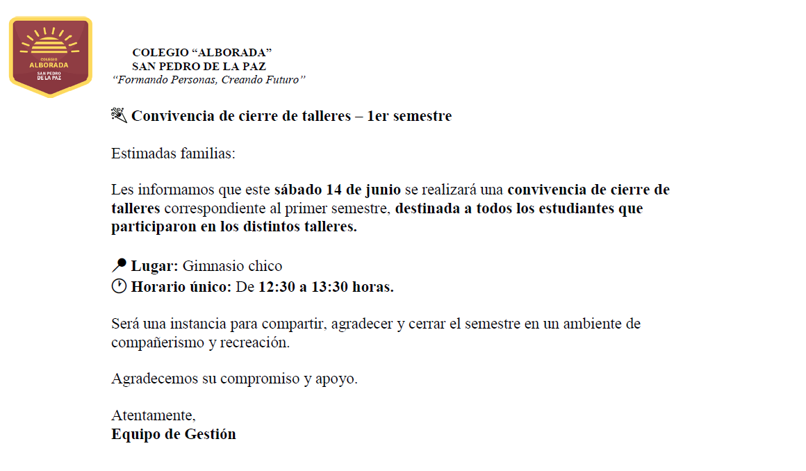 Fin De Primer Semestre 2025junio 17, 2025Promoción De La Interculturalidadjunio 17, 2025 Published by colegio alborada on junio 17, 2025 Categories 3NOTICIAS JUNIO Uncategorized Tags Descargar Share0 colegio alborada Related postsdiciembre 1, 2025Zumbaton en apoyo a teletónRead morenoviembre 21, 2025Semana del párvuloRead morenoviembre 14, 2025English Week En Colegio AlboradaRead more Deja una respuesta Cancelar la respuestaTu dirección de correo electrónico no será publicada. Los campos obligatorios están marcados con *Comentario * Nombre * Correo electrónico * Web Guarda mi nombre, correo electrónico y web en este navegador para la próxima vez que comente.