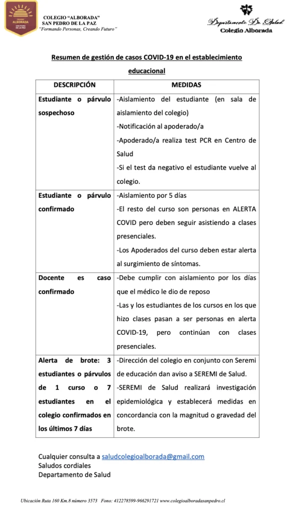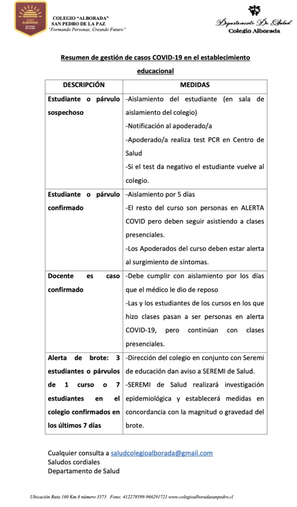 En el colegio alborada, nos enorgullece tener una comunidad comprometida con la salud. Trabajamos en estrecha colaboración con las familias y profesionales de la salud para asegurarnos de que nuestros estudiantes reciban la atención necesaria para su bienestar físico y emocional.