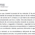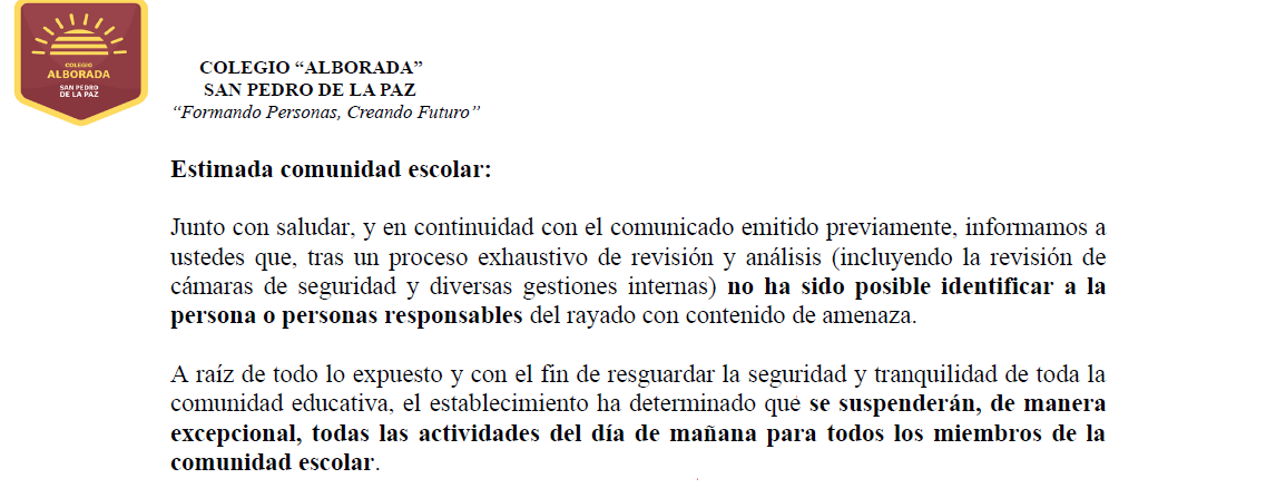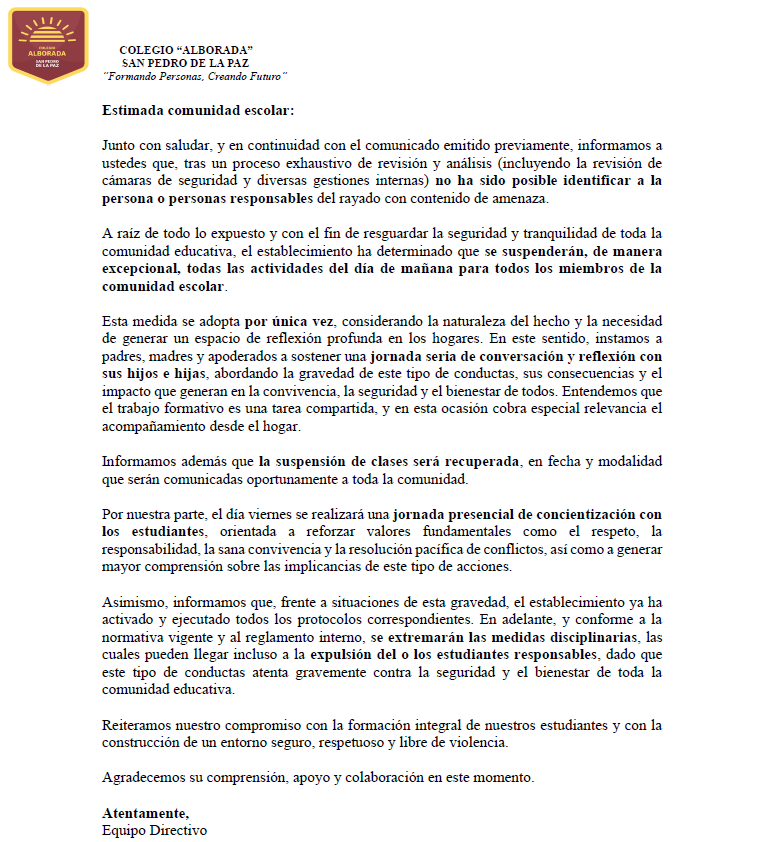 abril 15, 2026Se informa a toda la comunidad educativa que este jueves 16 de abril de 2026 se suspenderán las clases de manera excepcional. La jornada será recuperada en una fecha que será comunicada oportunamente. La medida busca resguardar la seguridad de los estudiantes y generar un espacio de reflexión en los hogares.